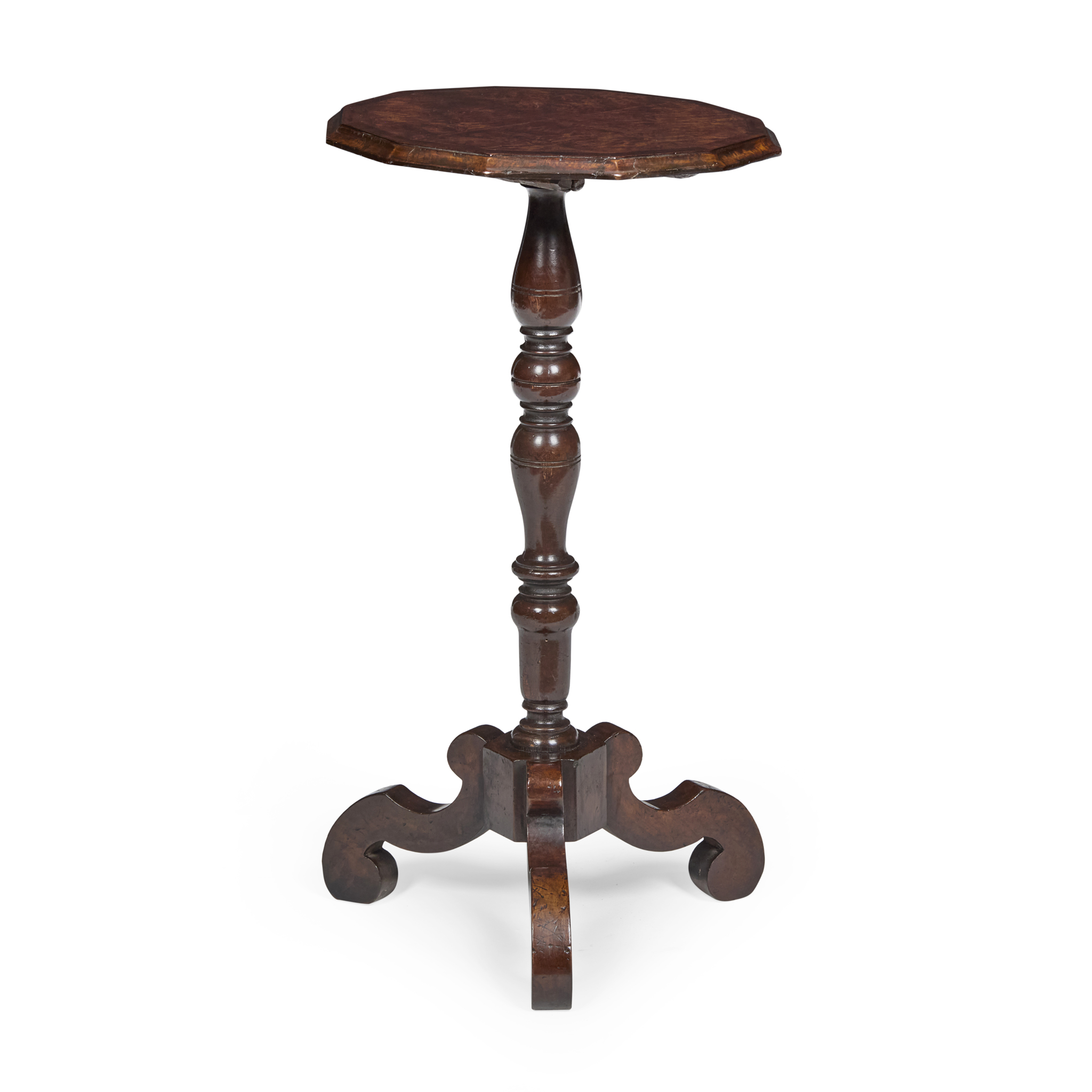 the twelve-sided banded top with simulated mulberry veneers, on a turned column support with a scrolling tripod base