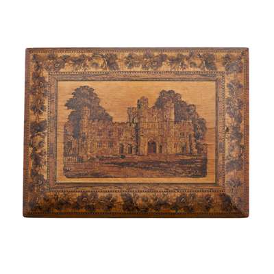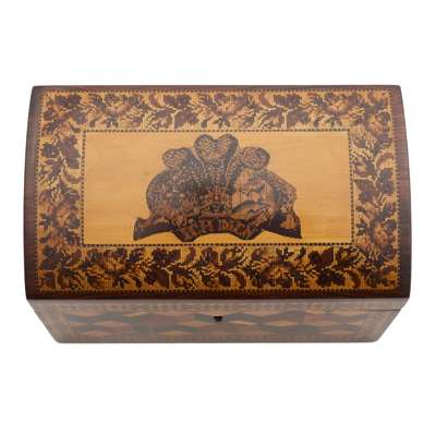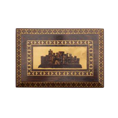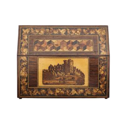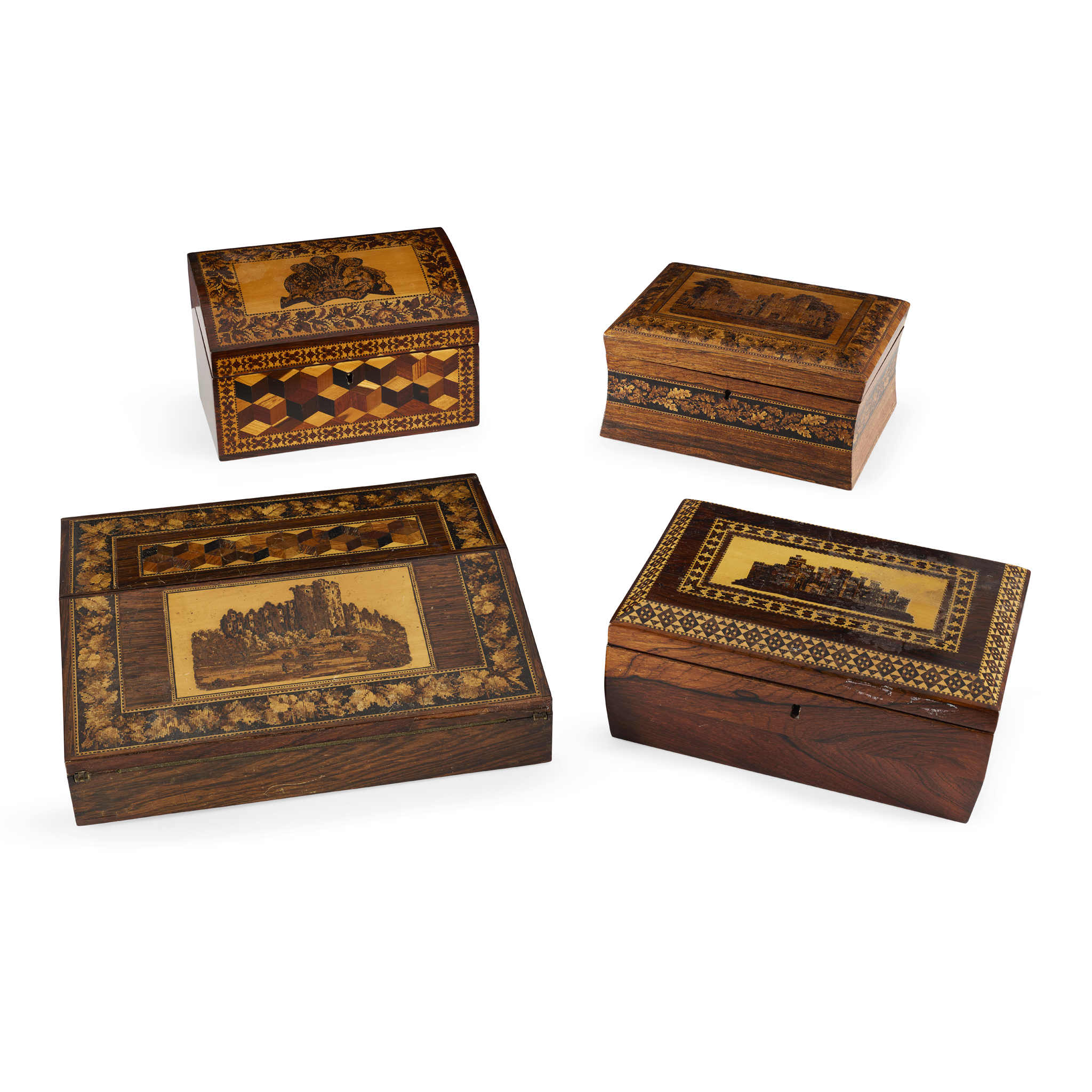 comprising a writing slope depicting castle ruins within a floral border; a sewing box with convex sides, the cover depicting a castellated house within a floral border, the interior lined with in purple paper and fabric, with two tiers, the upper tier fitted with various compartments; a letter box with a domed cover decorated with the Prince of Wales feathers, a lion, a unicorn and the motto ‘Ich Dien’, the front with a geometric parquetry facade; and a rectangular box decorated with a castle within geometric borders, the interior with two tiers (4)