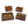 writing slope 20 cm wide, 8cm high, 22.4cm deep; sewing box 10.5cm high, 20.5cm wide, 15.5cm deep; letter box 12.8cm high, 20.6cm wide, 11.5cm deep; rectangular box with castle 23cm wide, 10.5cm high, 15.5cm deep