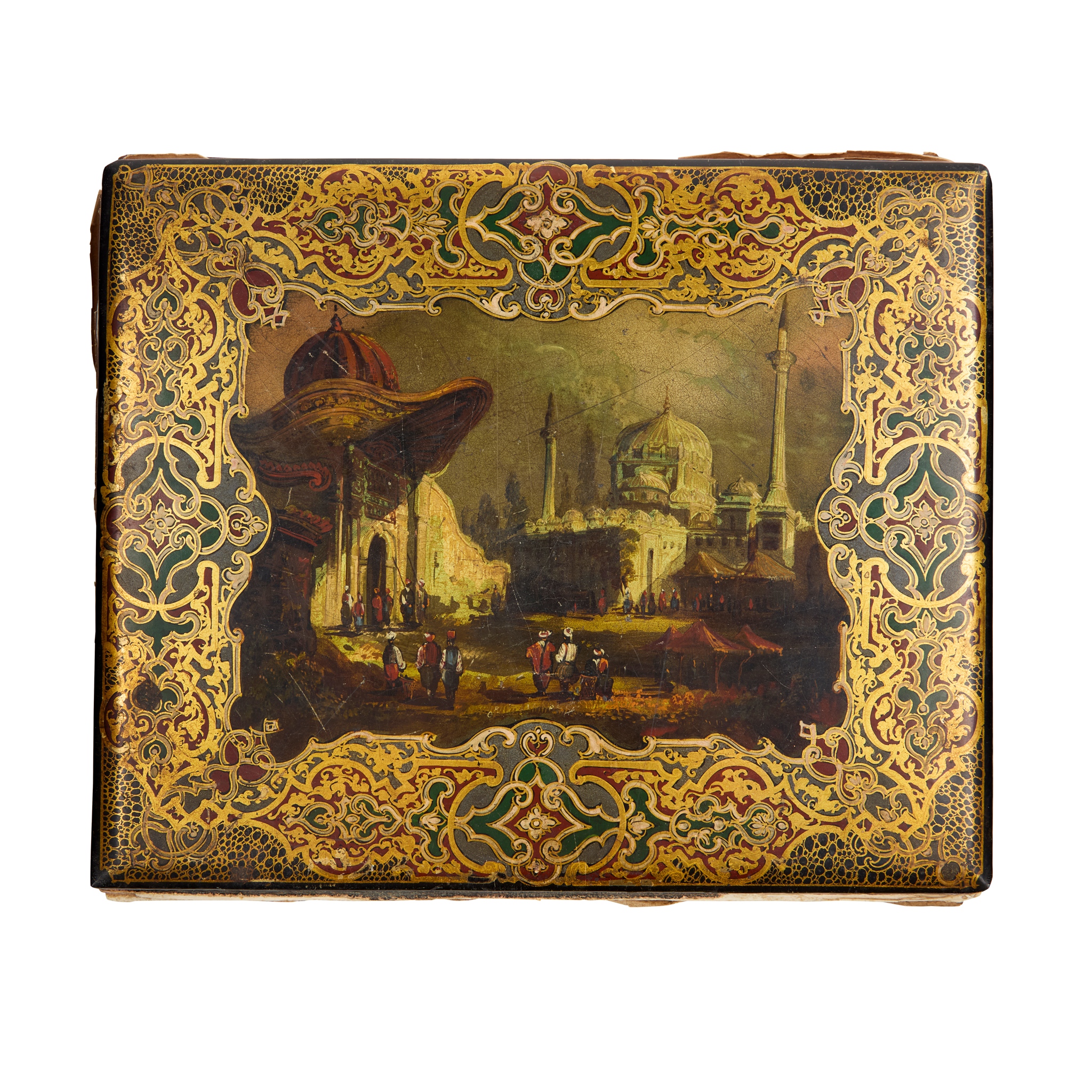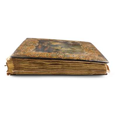 with lacquer papier mache covers [detached], the front cover painted with an exotic architectural and figurative scene within a scrolling gilt border with gilt highlights, frontispiece inscribed 'Sarah J Macleod' and dated 1851; including a variety of painted botanical studies, landscapes including a pencil sketch of ‘Rosstrevor Bay and Carlingford’, indistinctly signed; a pen and ink study of a galleon with ‘SMC’ monogram; sketches of Cape Town; a watercolour study of ‘Lough Neagh County Antrim Ireland’, signed A Young; photographs, scraps, and four Chinese pith paper paintings