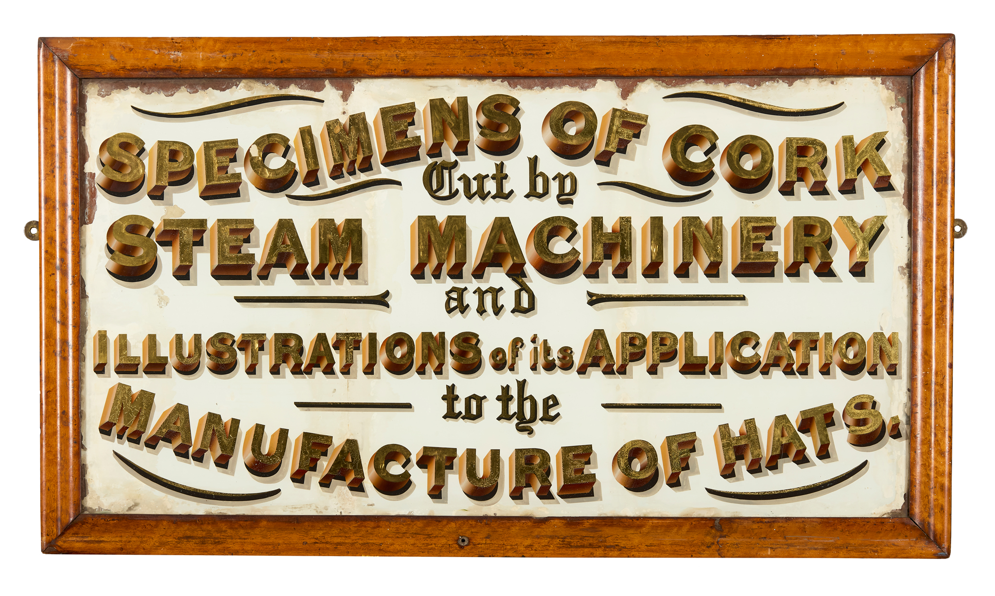 the gilt lettering on a white ground, ‘SPECIMENS OF CORK Cut by STEAM MACHINERY and ILLUSTRATIONS of its APPLICATION to the MANUFACTURE OF HATS’, in a birdseye maple veneered frame