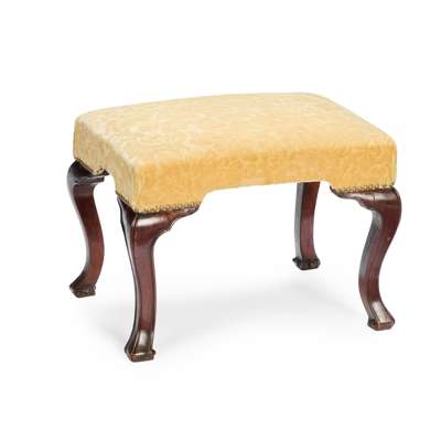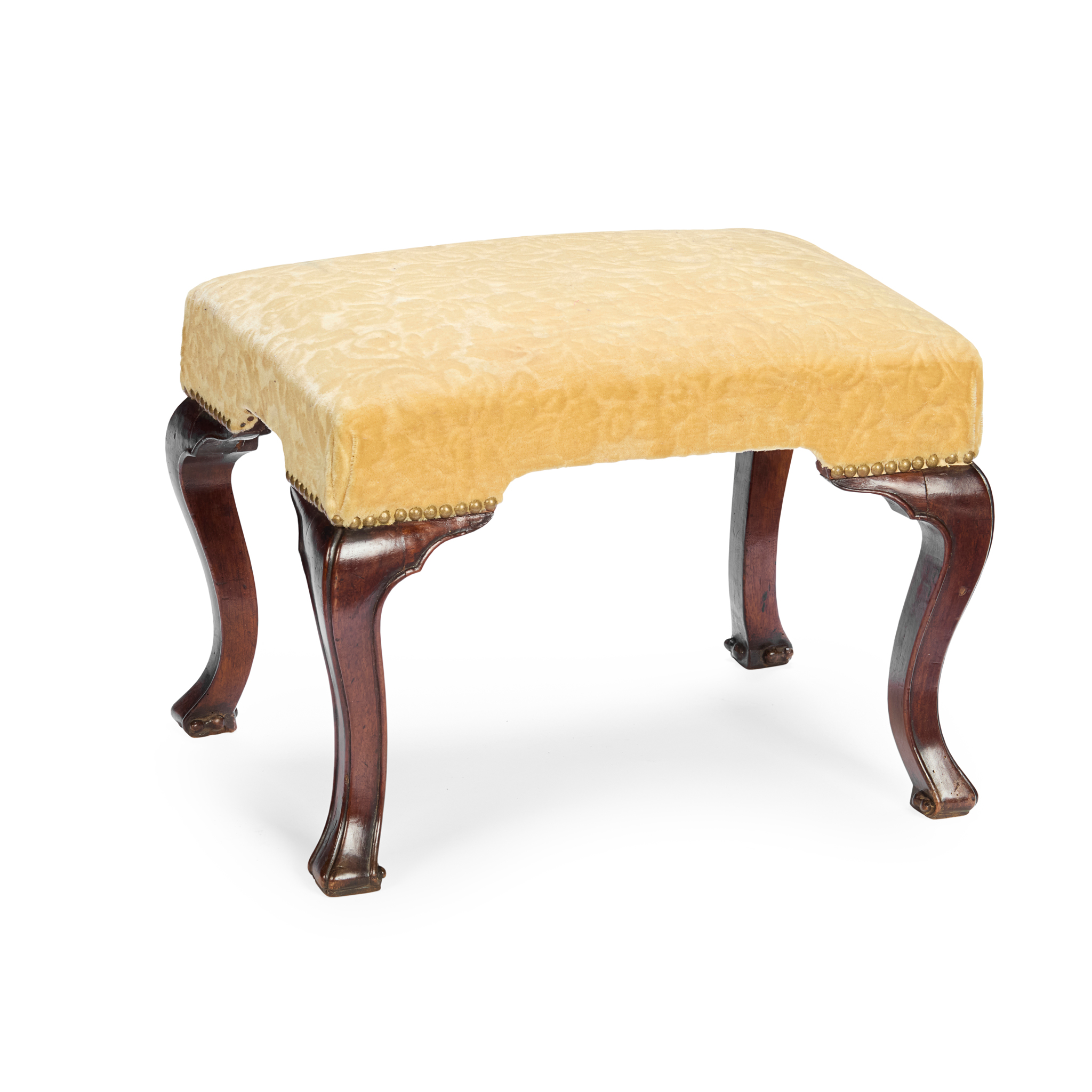 the padded rectangular seat in yellow plush fabric with close-nail trim, raised on cabriole legs with knurl feet