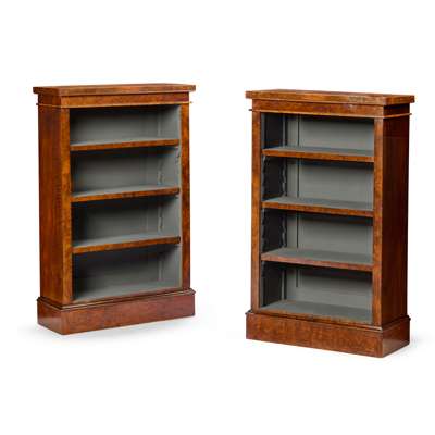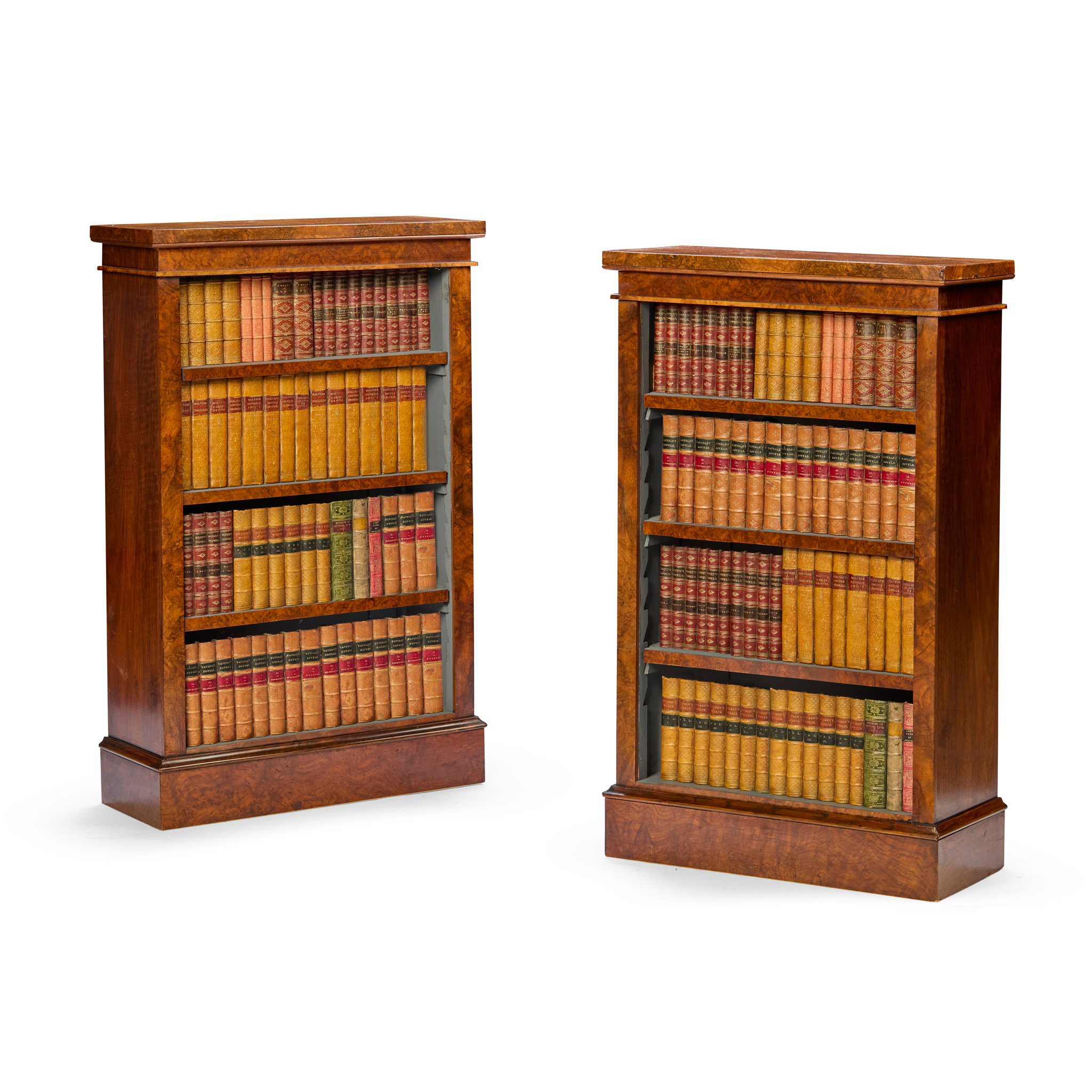PAIR OF VICTORIAN BURR AND FIGURED WALNUT SMALL OPEN BOOKCASES