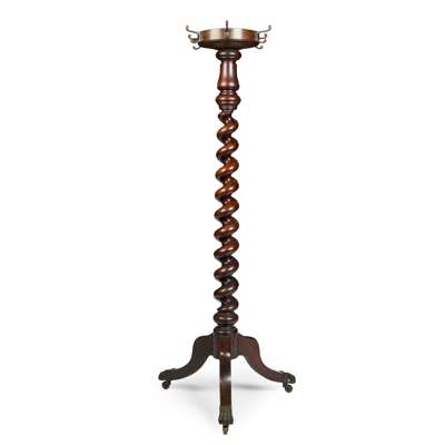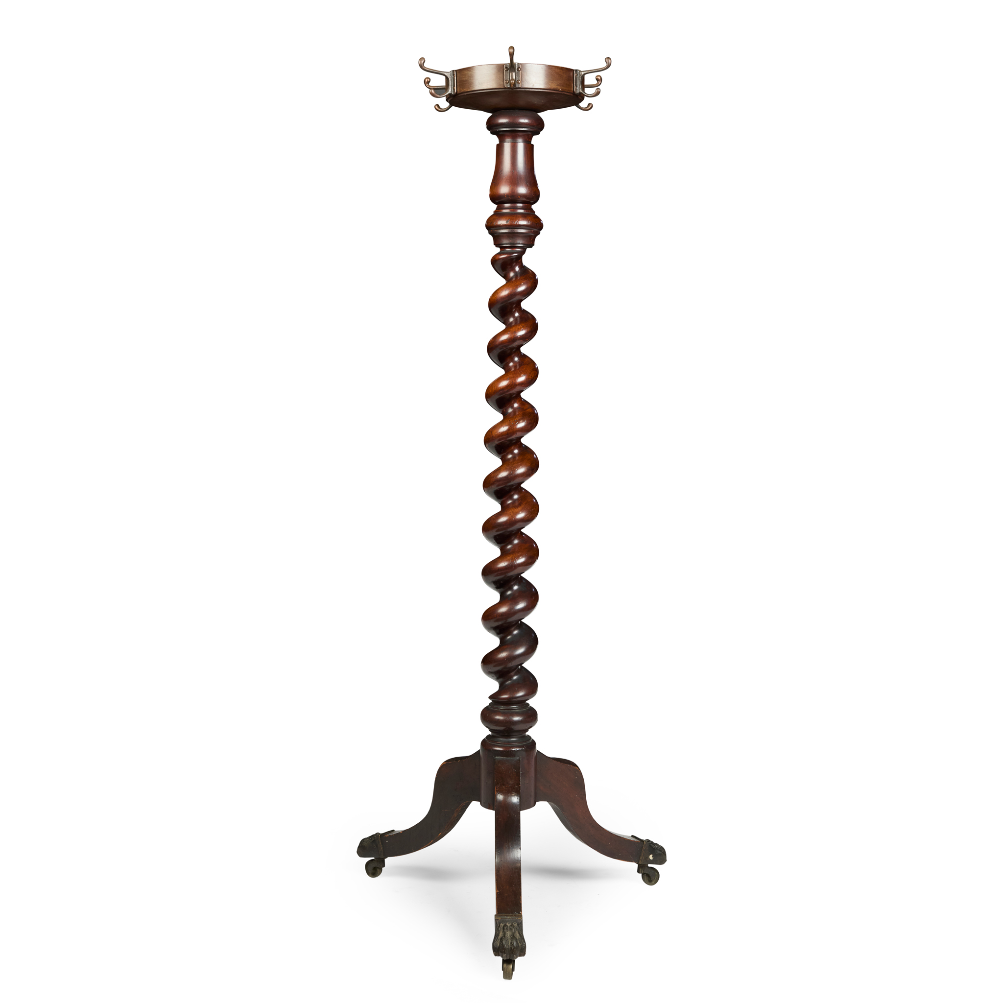 the circular platform top with six double coat hooks, above a spiral carved column on a tripod base, raised on three in brass lions paw caps and castors