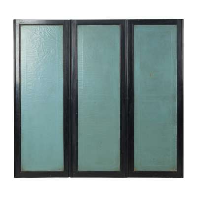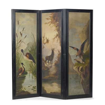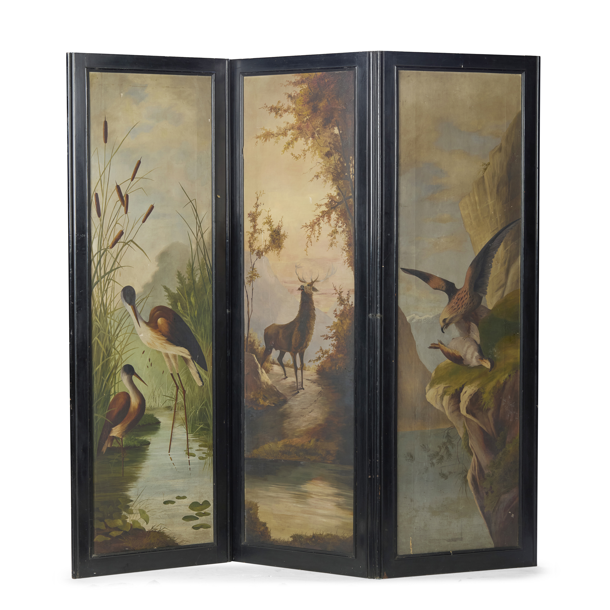 SCOTTISH VICTORIAN EBONISED AND PAINTED THREE PANEL FLOOR SCREEN
