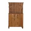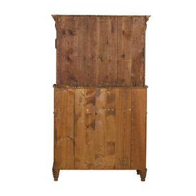 the moulded cornice above a cushion moulded frieze drawer, over a pair of doors opening to an arrangement of drawers; the later base with a secretaire drawer fitted with pigeon holes and drawers and a green leather writing surface, above a pair of cupboard doors enclosing shelves, raised on ring-turned tapered feet