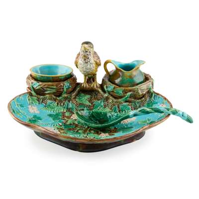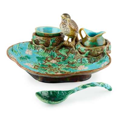 the trefoil dish moulded with strawberry plants, ferns and mosses, modelled with a song thrush perched between two nests, one inset with a sugar bowl and the other inset with a cream jug; together with a green glazed spoon of leaf moulded design, applied GJ factory mark and registration kite (4)