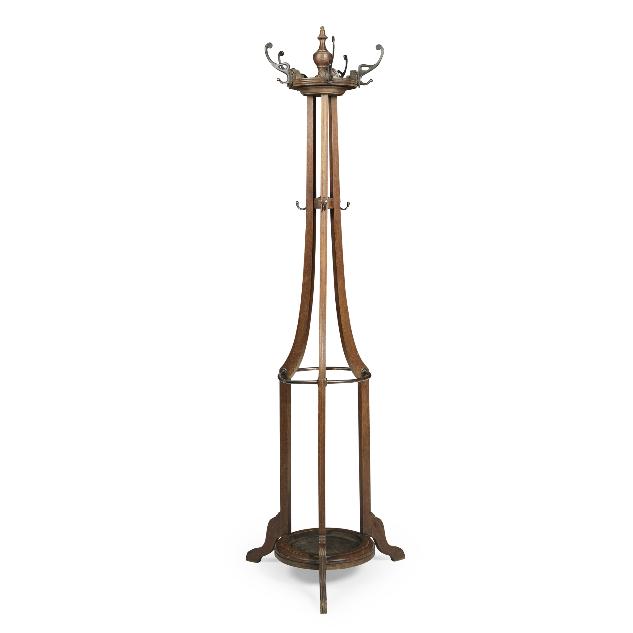 the upper part centred by an urn finial above a rotating platform with five brass coat hooks, on three reeded curved supports with a brass umbrella rail above a circular drip pan base, on reeded scroll feet