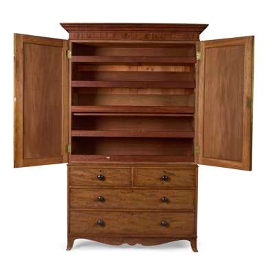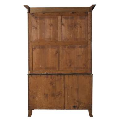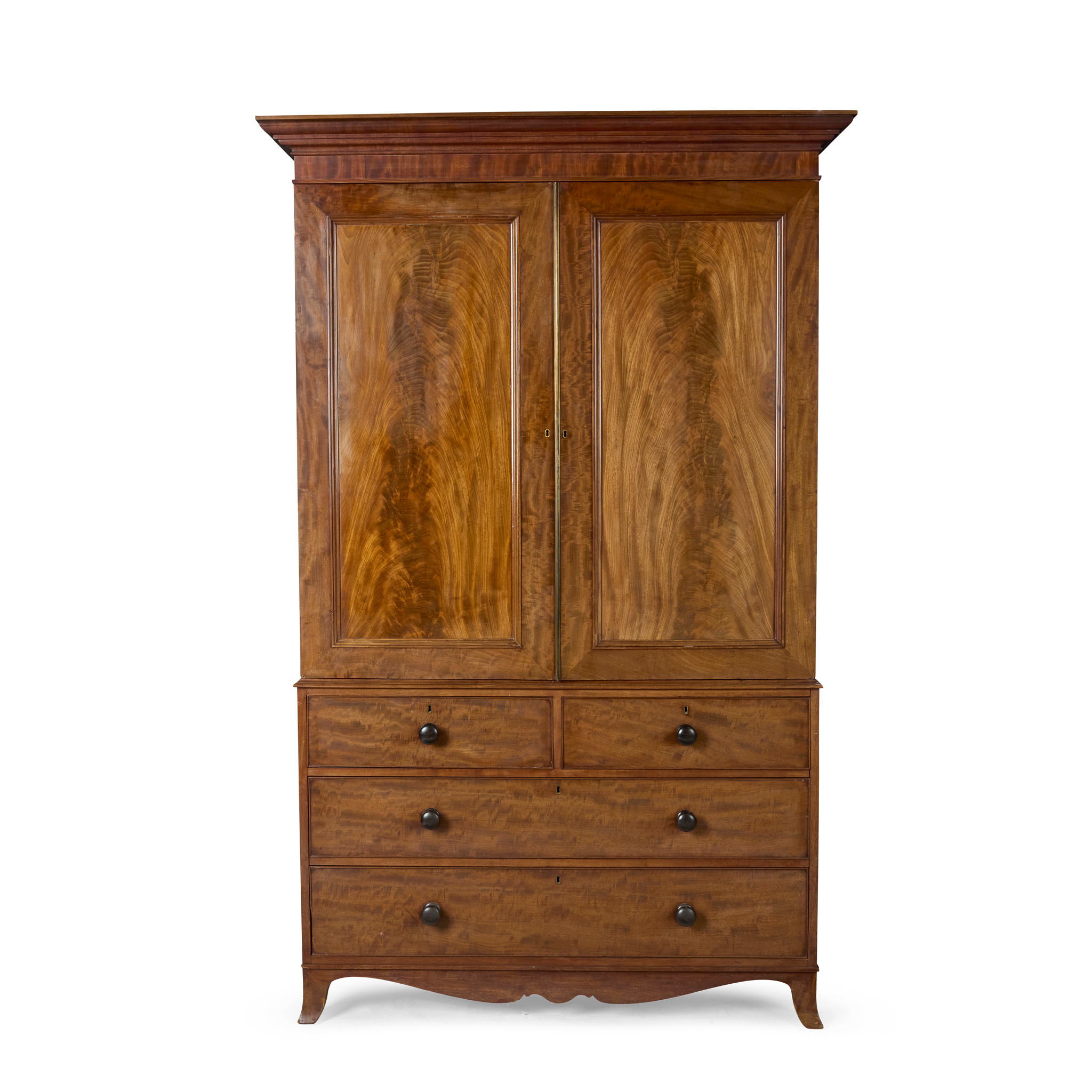 the moulded cornice above a pair of panel moulded doors enclosing sliding trays; the lower part with two short over two long drawers, raised on French bracket feet