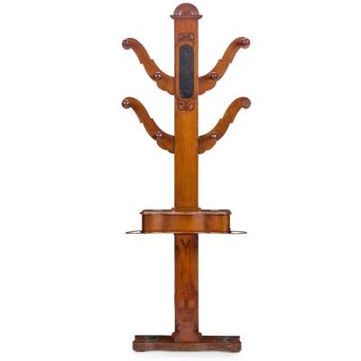 the central column mounted with a mirror and issuing four scrolling branches with turned coat pegs, above a hinged glove box and brass umbrella holders to the sides, on a pierced vasiform support and shaped base with twin metal lined drip pans