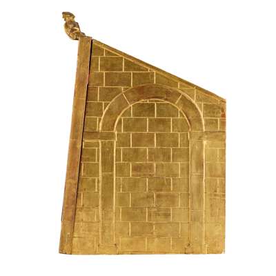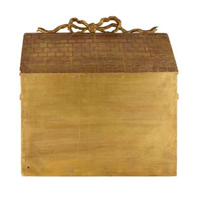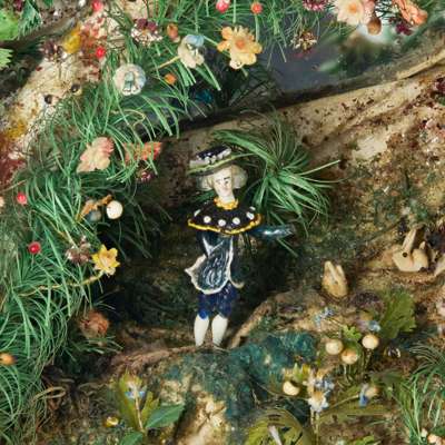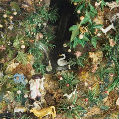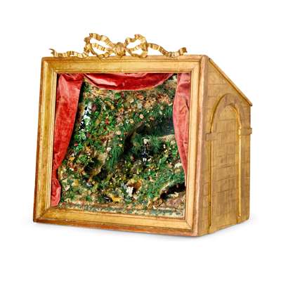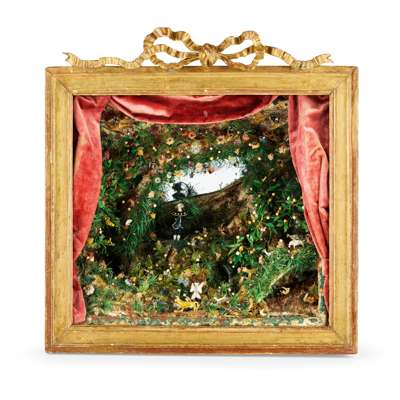 depicting a lavish bower, abundant with paper and wirework foliage with brightly enamelled or metallic fruit and flowers, with figures, animals and birds fashioned from glass lampwork and clay, the grotto with details that appear to sparkle and with features such as ponds and flowing water, the back with a mirror plate, with a pair of velvet curtains and a swag surrounding the scene, enclosed within a deep giltwood and gesso case with architectural details such as brickwork, arches and a tiled roof, the glazed front panel within a moulded frame surmounted with a tied ribbon