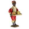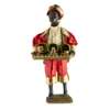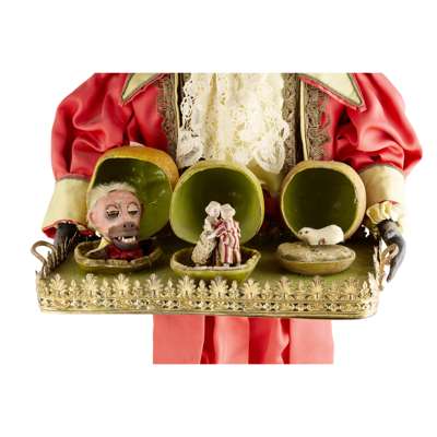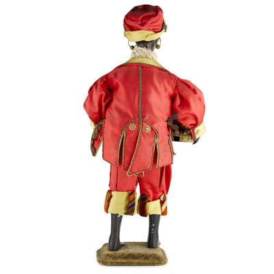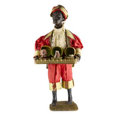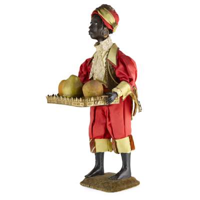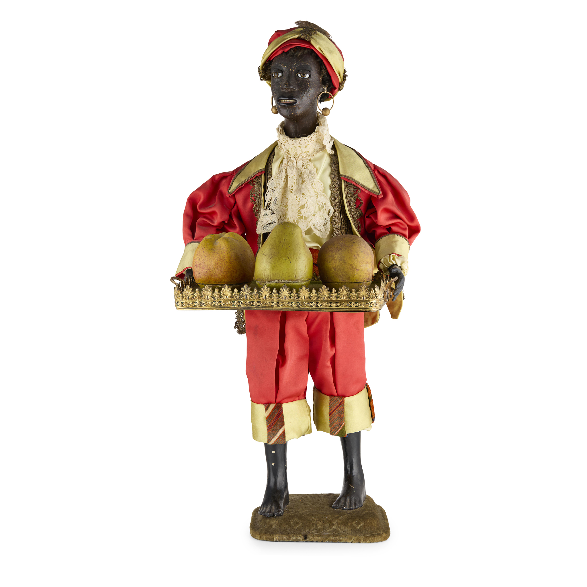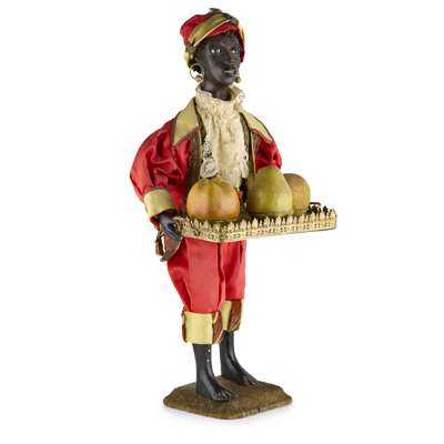 the leather covered papier-mache head, with an open mouth showing rows of teeth, articulated eyelids and a real hair, the head turns, the figures holds a gilt metal tray displaying three papier-mache fruits, each opens to reveal a running mouse, two dancing figures and a turning monkey's head with an articulated jaw, the figure modelled standing, wearing a crimson and gold satin suit with filigree gilt trimmings and a lace cravat, raised on a moulded velvet covered base, operated with a keywind, the mechanism within the body, with painted inscription to the base ‘G. Chant 18/11/91’