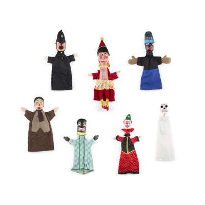 all with painted carved wood and papier-mache faces and hands with fabric clothed bodies, including a figure of Mr Punch and six other associated characters (7)