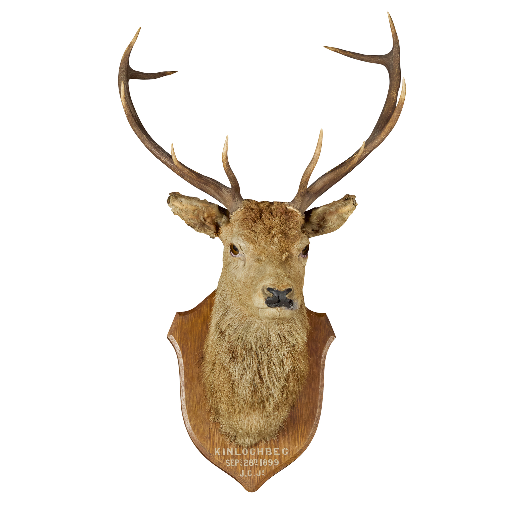 mounted on an oak shield with painted inscription 'KINLOCHBEG - SEP 28TH 1899 J.C.Jr'