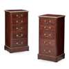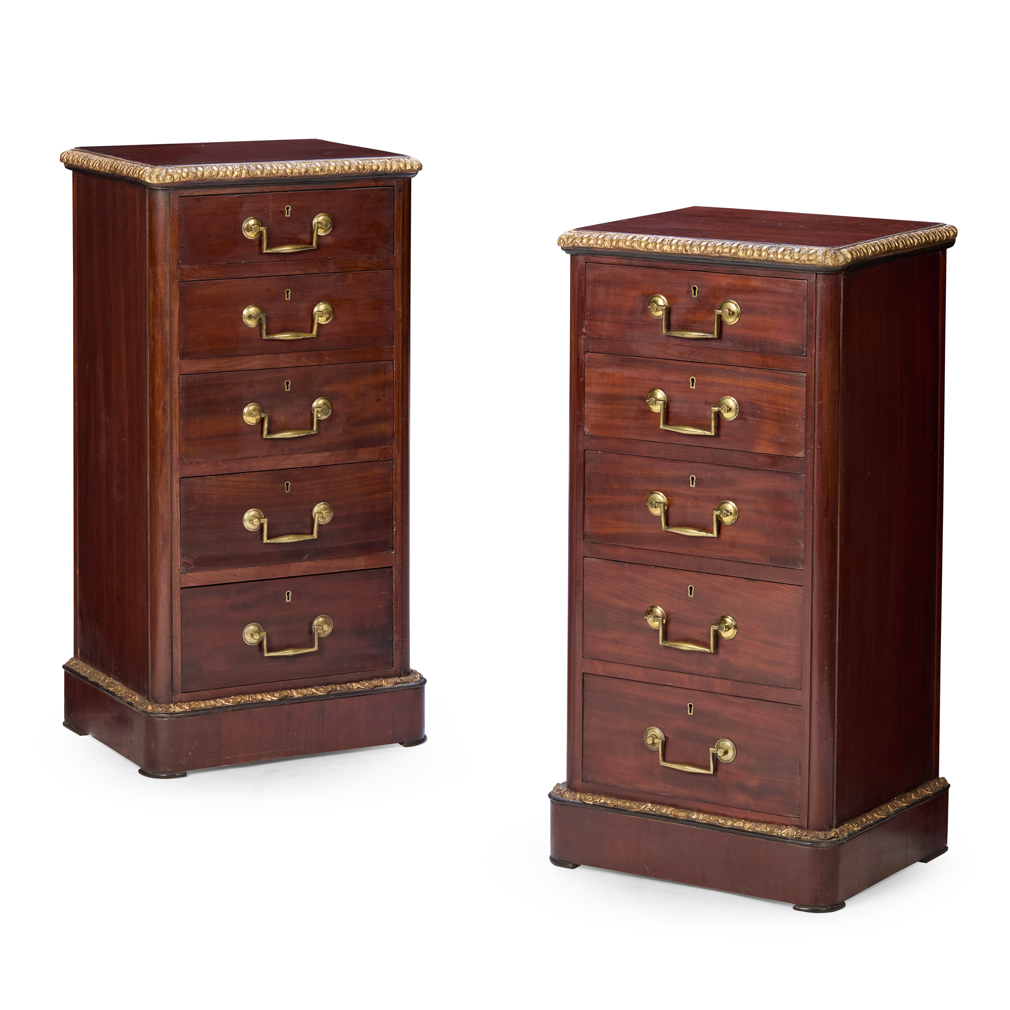 the tops with gilt moulded edges above five graduated drawers, on plinth bases with further gilt moulding (2)