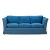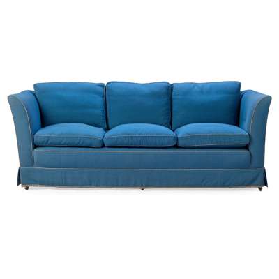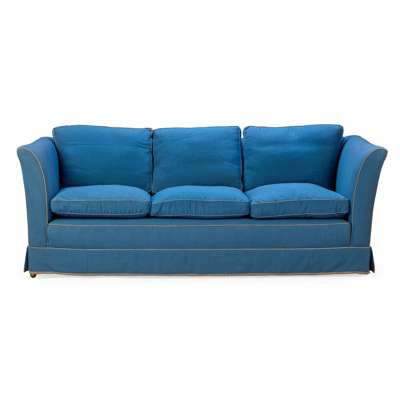 the backs with three loose cushions above three loose cushion seats, flanked by high arms, raised on five square legs ending in castors, covered in blue upholstery outlined with cream piping (2)
