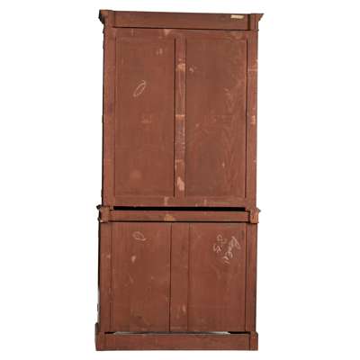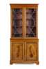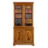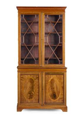 of neat size, the top with a moulded cornice above a pair of astragal glazed doors enclosing adjustable shelves; the lower part with a pair of moulded doors with oval panel veneers crossbanded with satinwood, raised on bracket feet