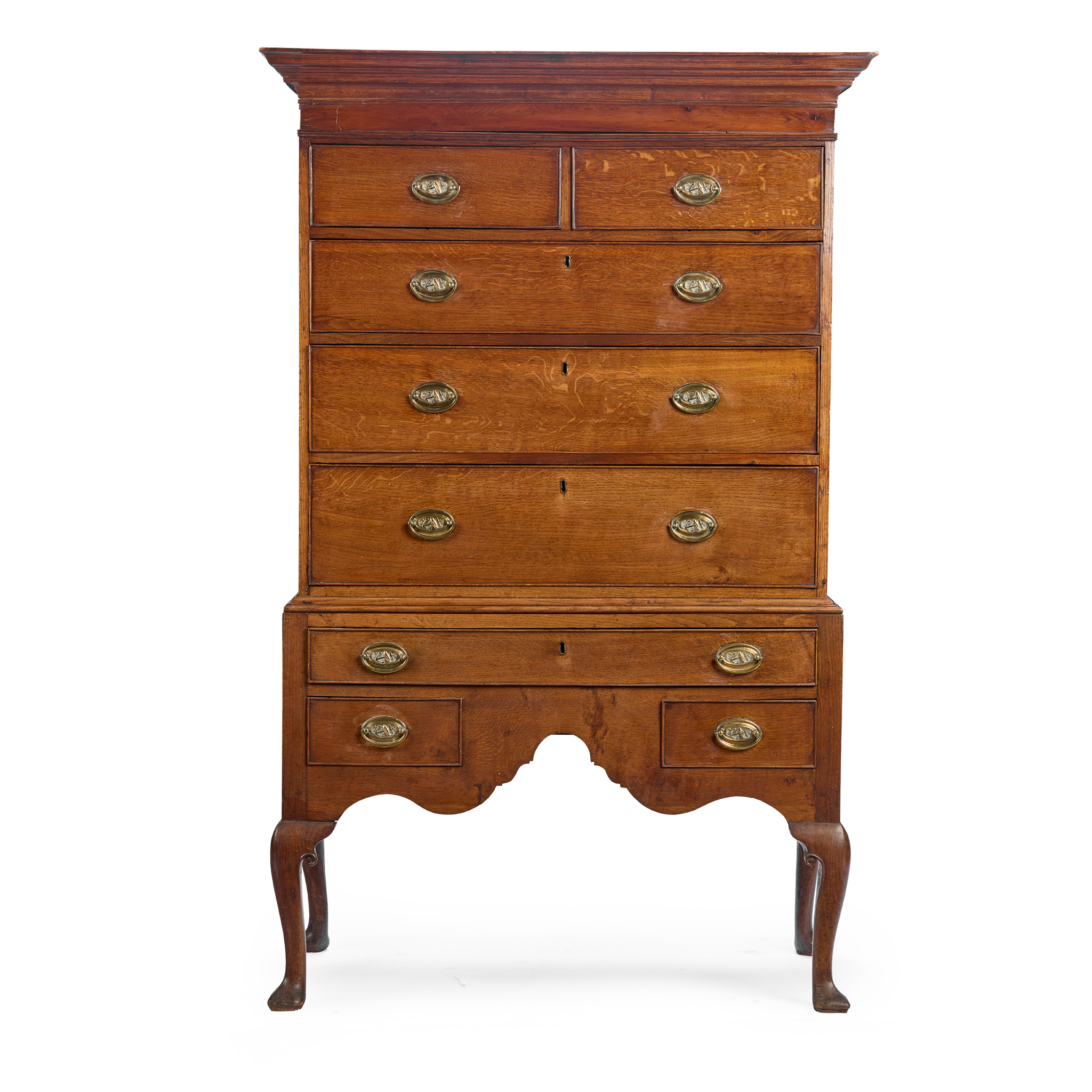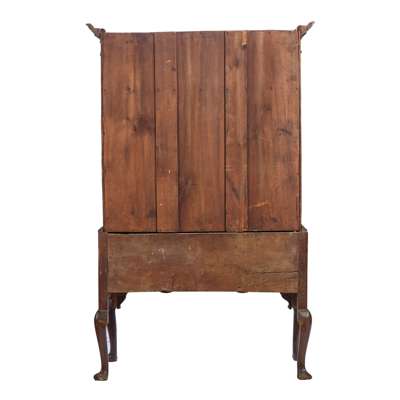 the moulded cornice above a two short drawers and three long graduated drawers; the lower part with a long frieze drawer and two short drawers arranged around a shaped apron, raised on cabriole legs ending in pointed pad feet