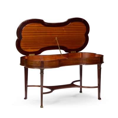 the waisted hinged top with rounded ends and covered in striped upholstery, opening to a twin compartment interior, raised on square tapered legs joined by a curved stretcher centred by a platform shelf