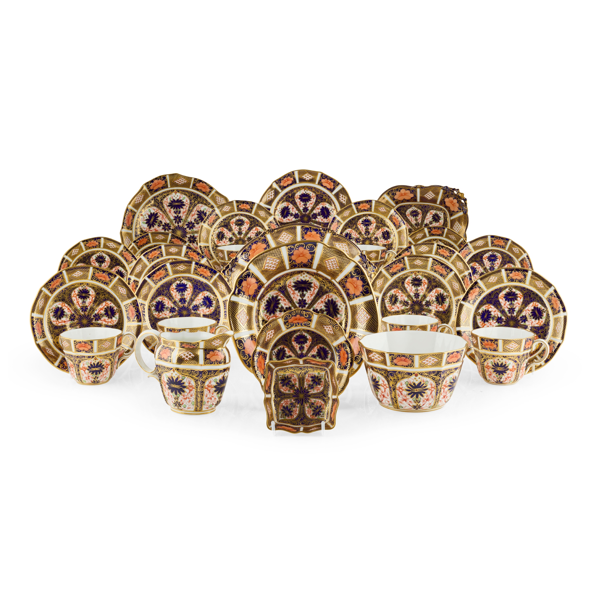 pattern 1128, various dates; comprising: twelve cups, 6.5cm high; twelve saucers, 14cm diameter; twelve side plates, 18cm diameter; a cream jug; a sugar basin; two round cake plates, 22cm diameter; two square dishes on pierced feet, 18.5cm x 18.5cm; a round shallow bowl, 17.5cm diameter; an oval dish, 23cm wide; a small round dish, 11.2cm diameter; and a small square dish, 7.5cm x 7.5cm; printed and impressed factory marks (qty)
