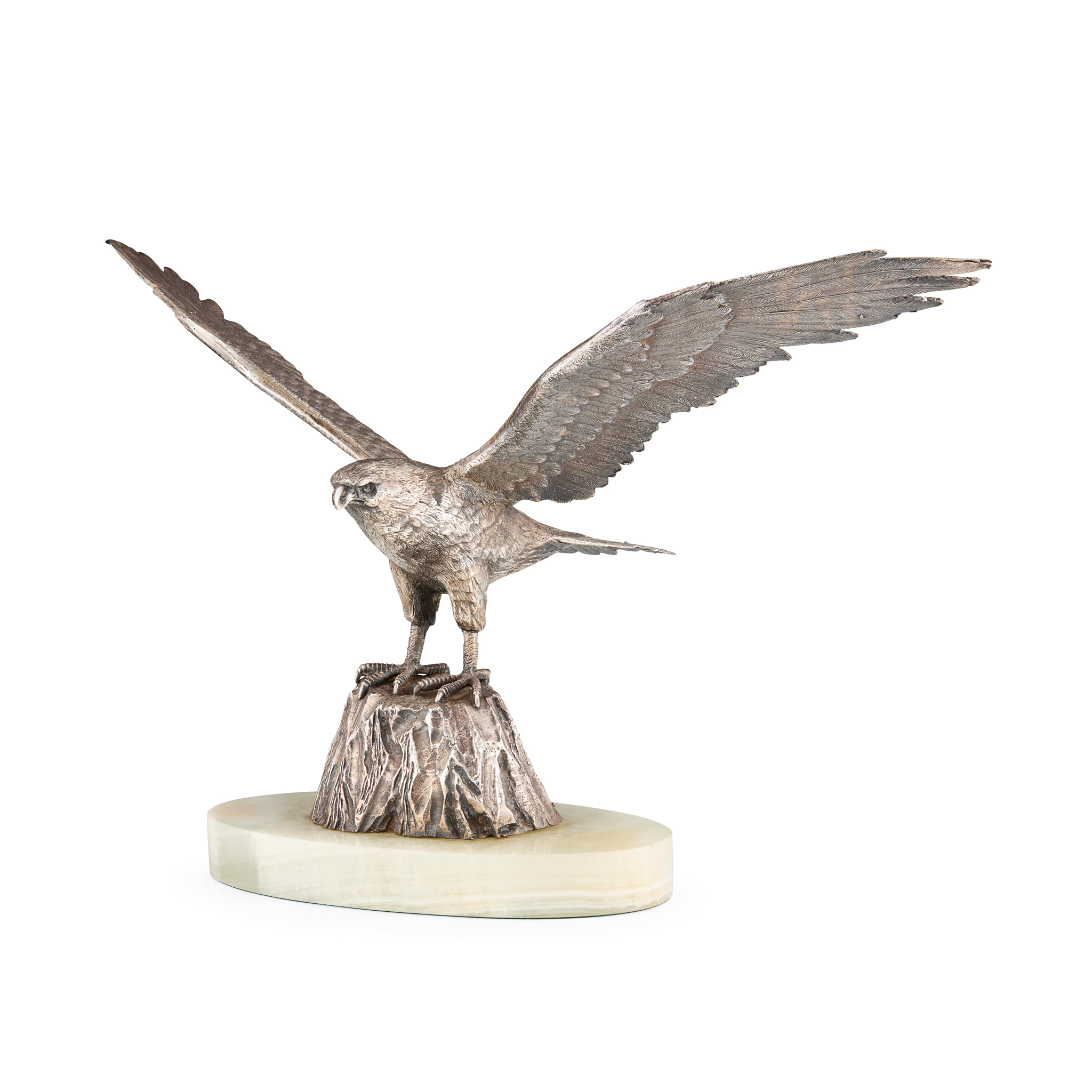 modelled with its wings spread, perched on a rocky plinth, mounted on an oval white onyx base