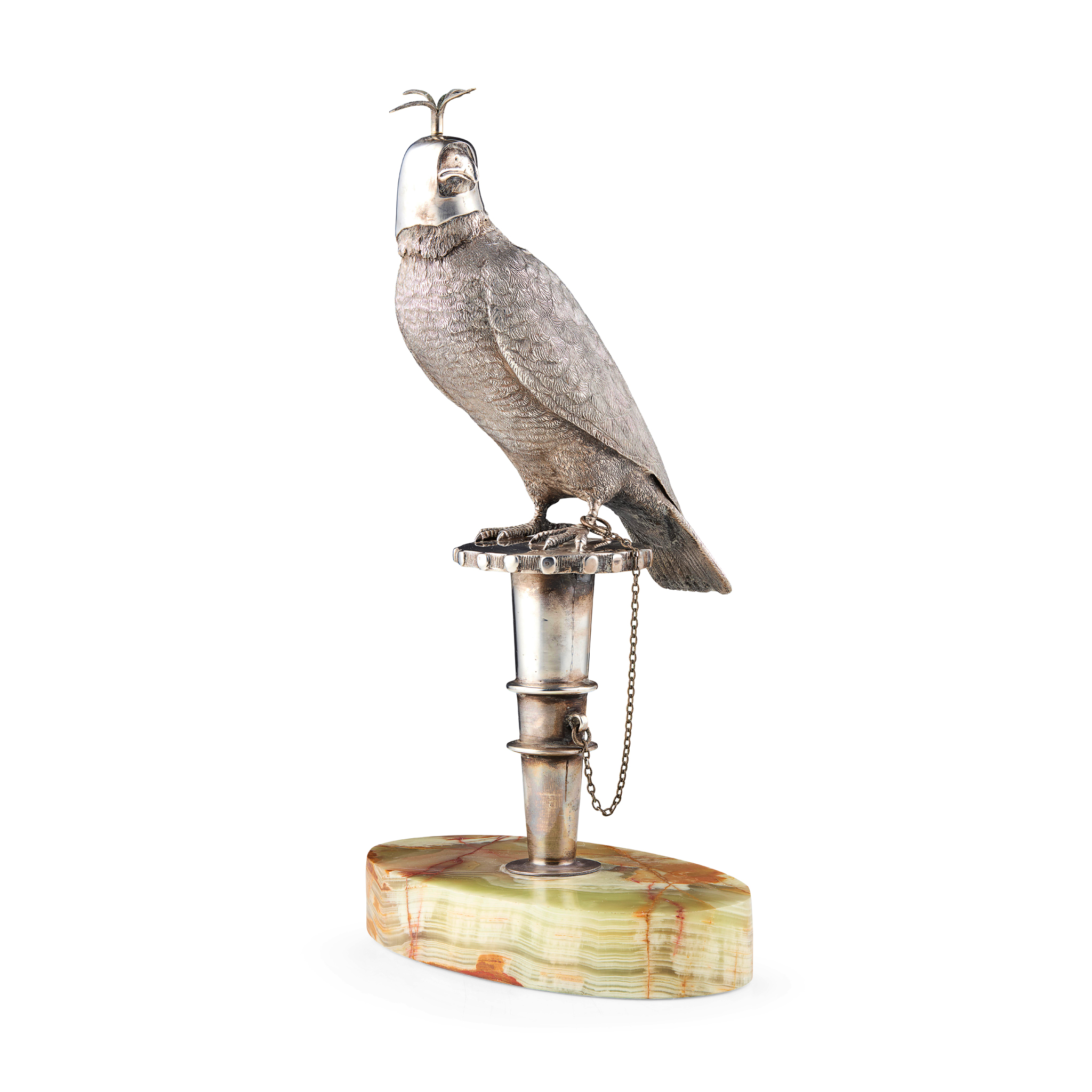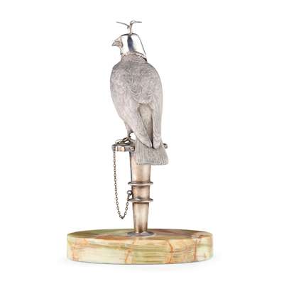 modelled wearing a plumed hood, its leg chained to a pedestal, on an oval green onyx base