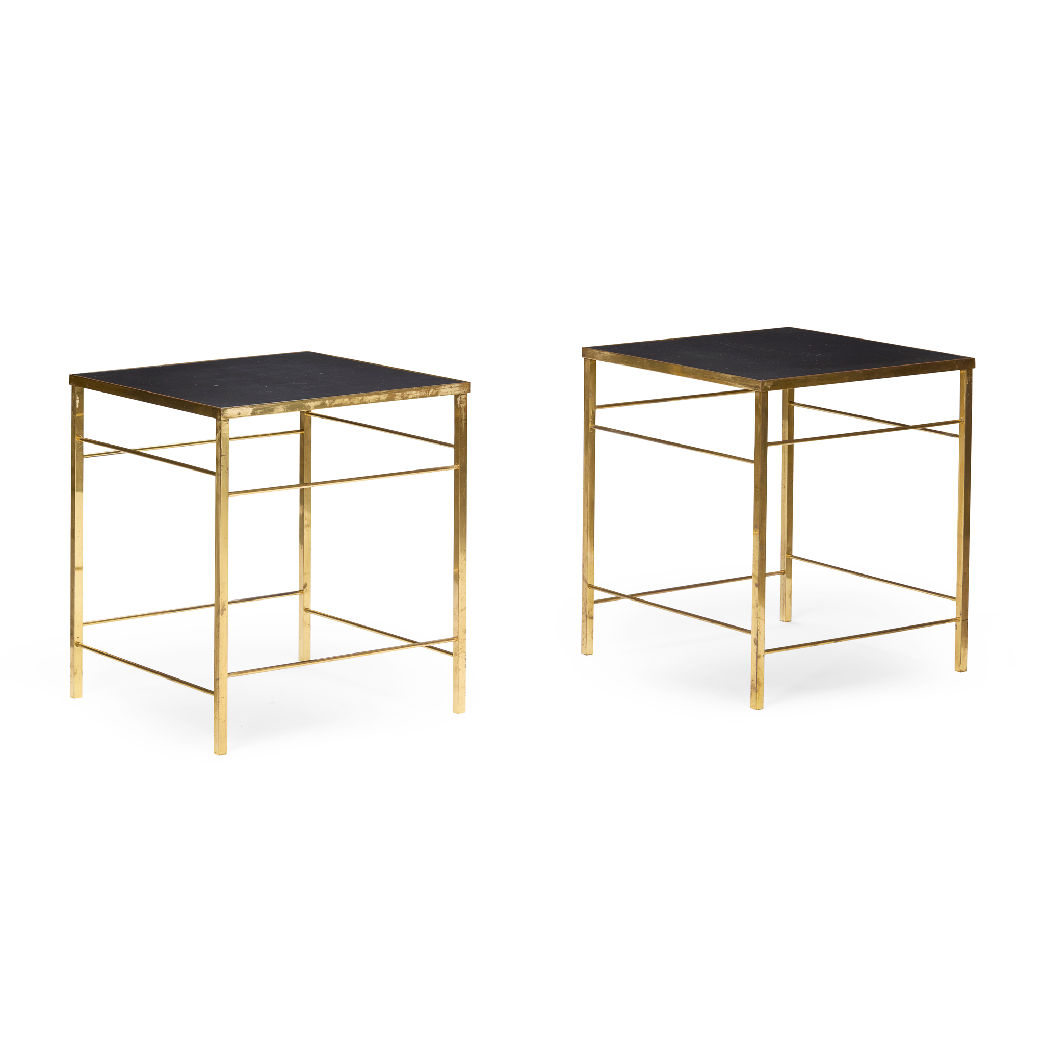 the square ebonised wood insert tops in a brass frame raised on square straight legs joined by double stretcher rails (2)