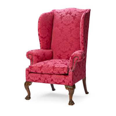 the tall padded back and wings above a loose cushion seat flanked by scrolled arms, raised on acanthus carved cabriole legs ending in hairy paw feet; upholstered in wine red damask type fabric with close nail trim