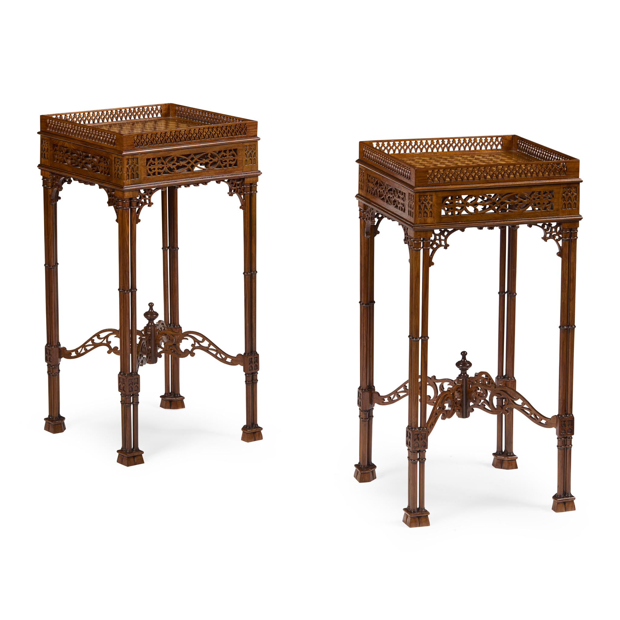 the square crossbanded tops with tumbling block parquetry enclosed by fretwork galleries, above pierced fret friezes and raised on cluster column supports united by arched pierced X-stretchers and ending on tassel feet (2)