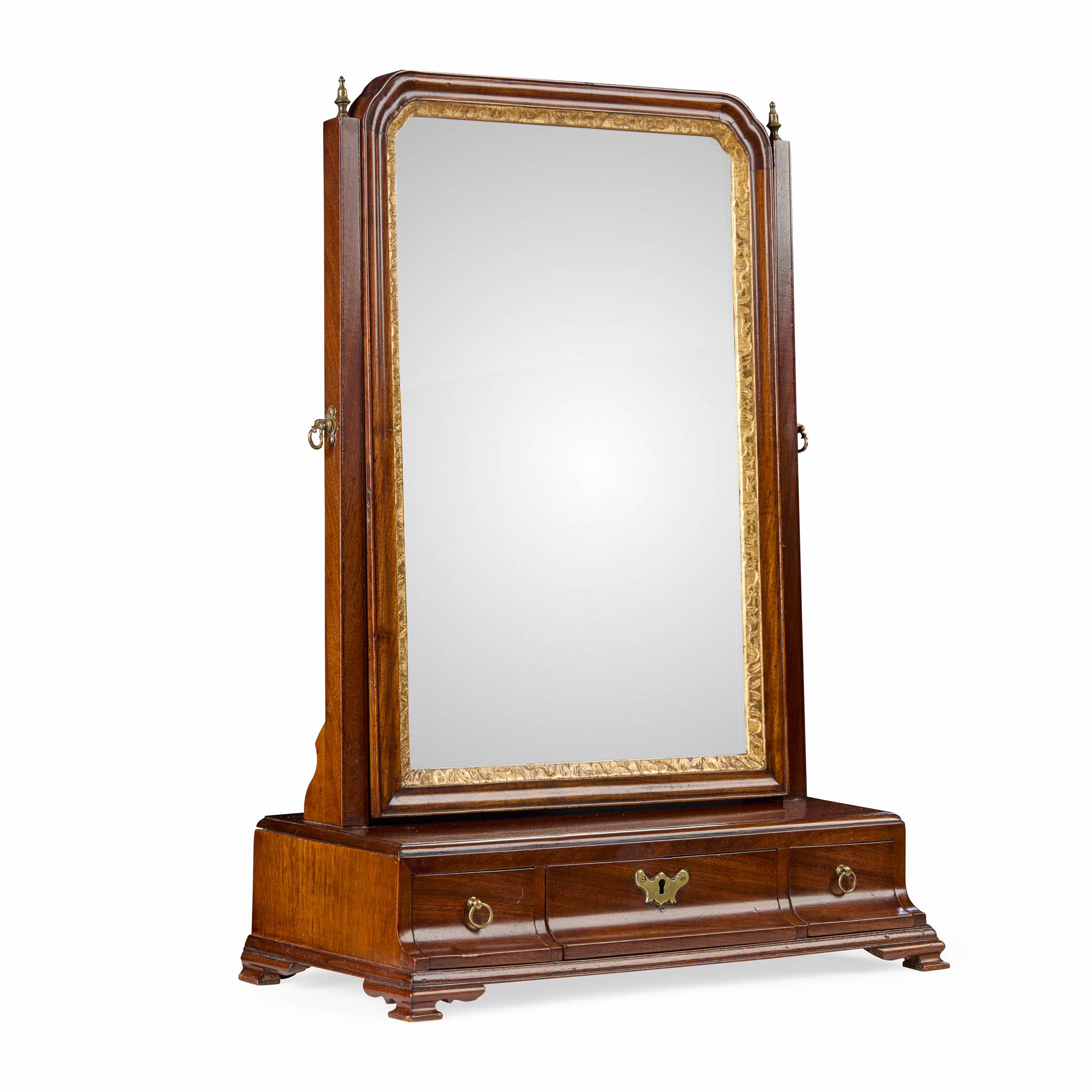 the arched mirror plate in a foliate gilt moulded slip and moulded frame, between tapered supports with brass urn finials, the base with three ogee moulded short drawers, on ogee bracket feet