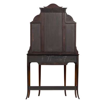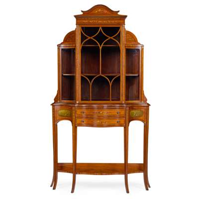 in the Sheraton style, the upper cabinet with a central glazed door with mullions flanked by glazed side panels, enclosing a shelved interior; the lower part of serpentine outline with a pair of centre drawers flanked by concave panels, raised on square tapered legs joined by a serpentine undertier; the whole decorated with flower garlands, trophies, medallions, and masks