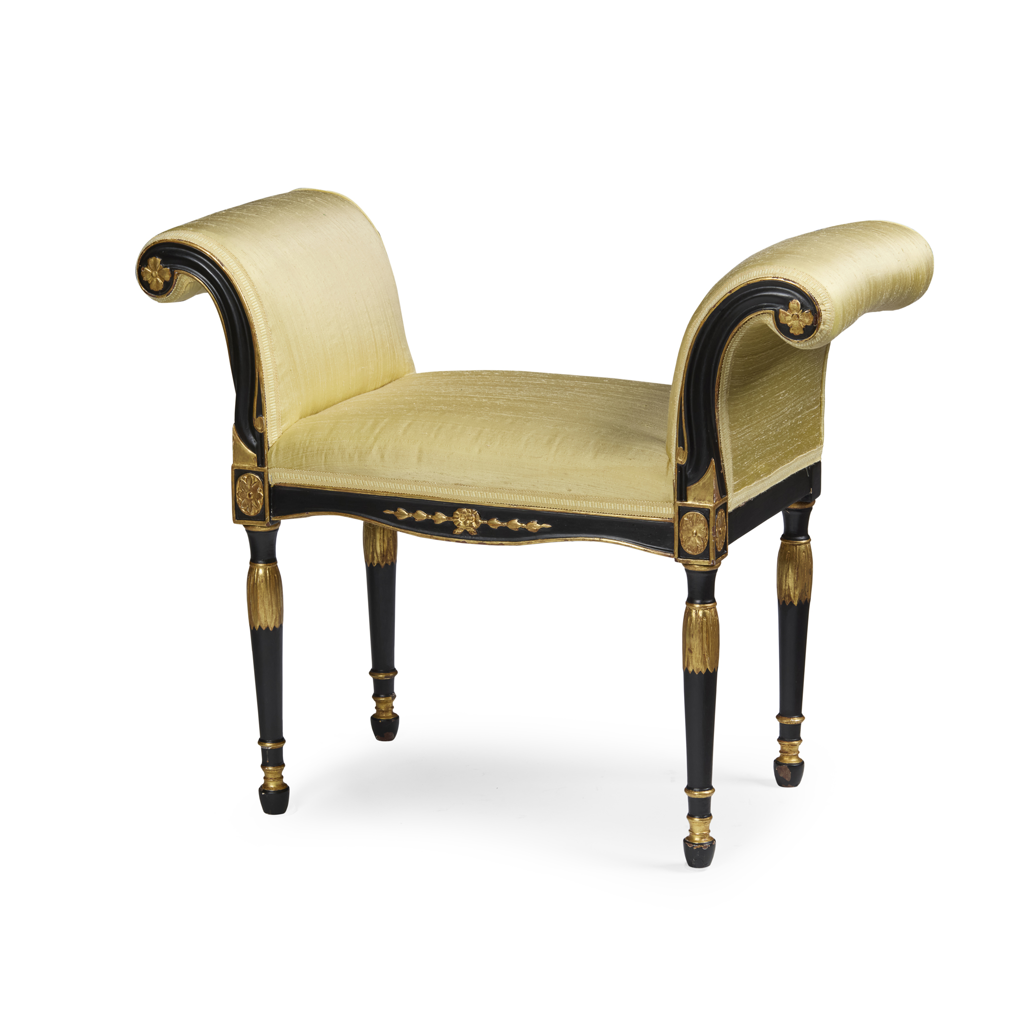 with high scrolled arms above a stuff-over seat, the seat rail and arm facings ebonised with gilt details, raised on leaf capped tapered legs with further gilt highlights; covered in yellow silk upholstery