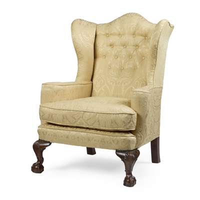 the arched buttoned back flanked by scrolled wings above a loose cushion seat and out-scrolled arms, raised on shell-carved cabriole front legs ending in claw and ball feet, in butter yellow brocade upholstery
