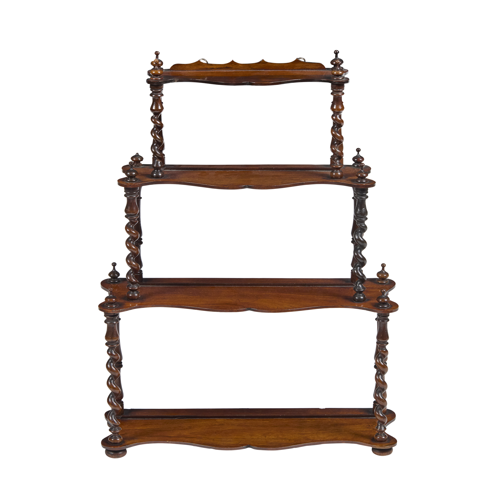 with four serpentine graduated tiers, raised and divided by spiral turned supports