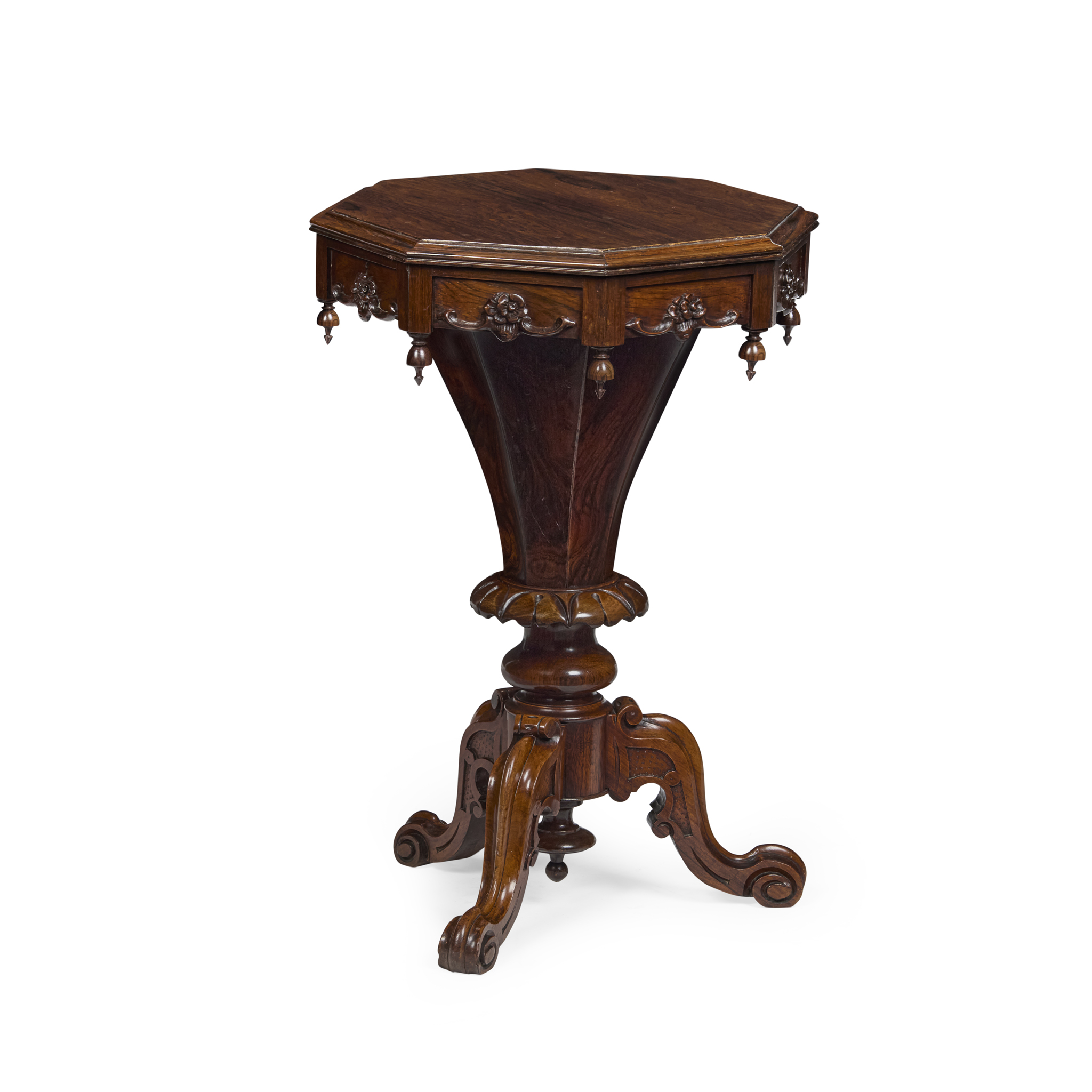 the hinged octagonal top opening to compartmented silk lined interior, above a flower and scroll carved frieze with pendent finials, on a faceted tapered column and cabriole legs ending in scrolled feet