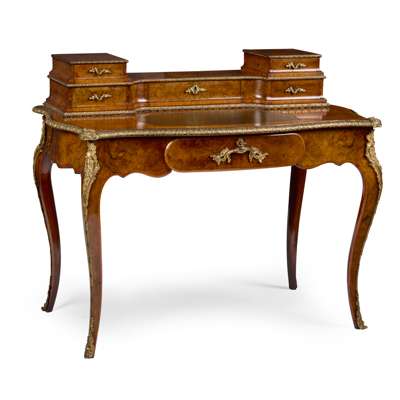 in the French taste, the shaped rectangular top with a leather insert and stepped superstructure fitted with an arrangement of drawers, all banded in foliate cast gilt metal, above single frieze drawer and raised on cabriole legs with gilt metal mounts