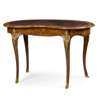 the crossbanded top with a brown tooled leather writing surface and moulded edge, above a single long frieze drawer, raised on cabriole legs with gilt metal mounts and sabots