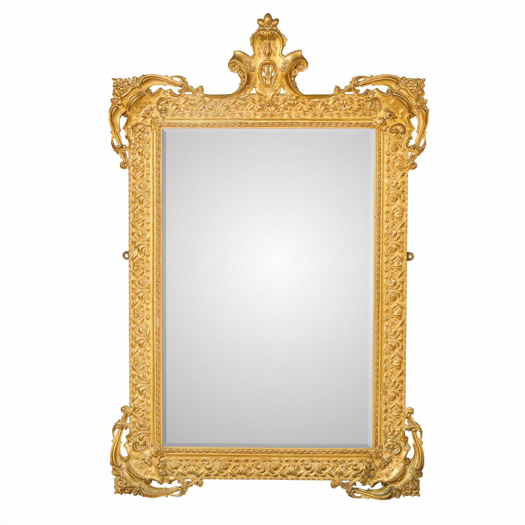 the rectangular bevelled mirror plate in a palmette moulded and acanthus frame surmounted by a cartouche
