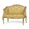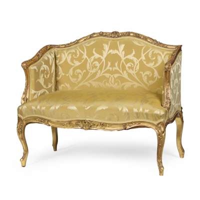 in the Louis XV taste, the arched back and high enclosed arms above a serpentine stuff-over seat, raised on cabriole legs, the frame carved with flower and foliate scrolls; in yellow silk foliate damask