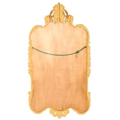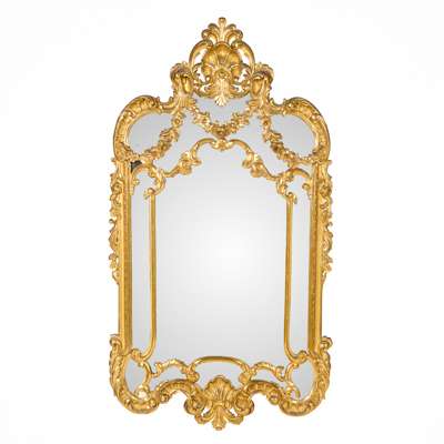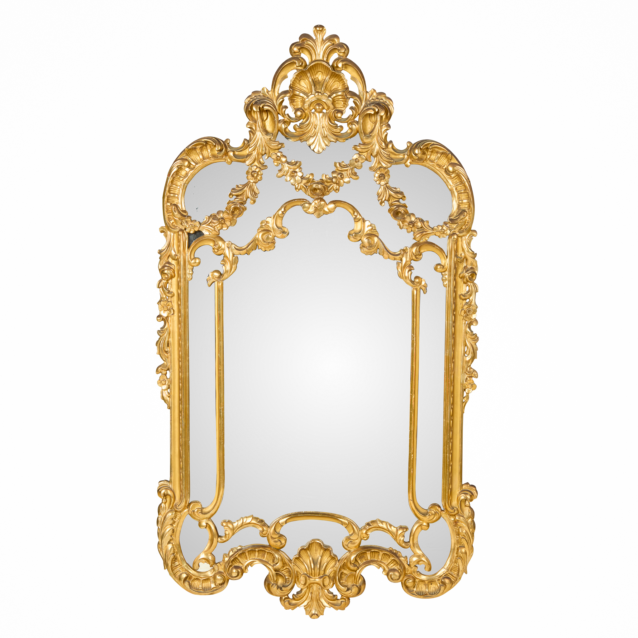 in the Louis XIV style, the shaped mirror plate enclosed by margin plates in a pierced and carved frame with C scroll, rocaille, and surmounted by a shell cresting