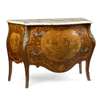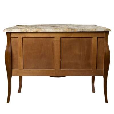 LOUIS XV STYLE MAHOGANY, FRUITWOOD, AND MARQUETRY MARBLE-TOP COMMODE