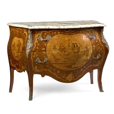 the serpentine grey veined marble top with a moulded edge, above two long serpentine and bombe drawers, centred by a reserve inlaid with a scene depicting a musical soiree, enclosed by floral marquetry, the sides with reserves of courting couples, the angles with gilt metal mounts and raised on cabriole legs ending in sabots