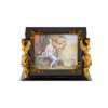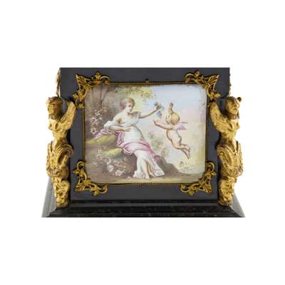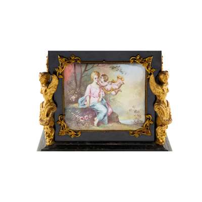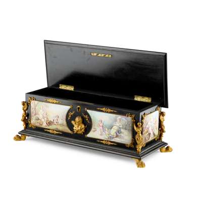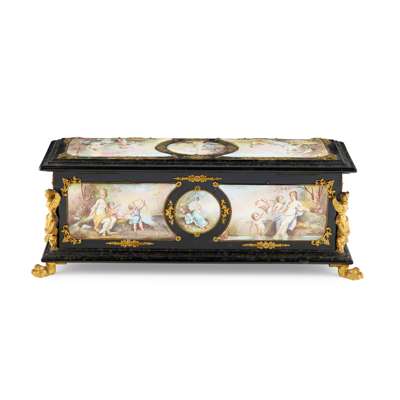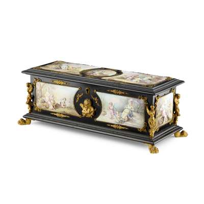 of rectangular form with hinged cover, the panels painted with various figurative scenes of putti and maidens, including depictions of The Four Season's, the corners with caryatid mounts, with further stylised foliate mounts, the front panel centred with a putto mount, raised on hairy paw feet