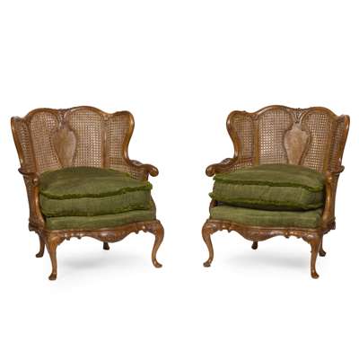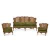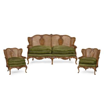 comprising a settee and a pair of armchairs, all with double-walled caned panels to the backs and arms, in foliate carved frames with vasiform splats above loose cushion seats covered in green plush fabric with fringe trim, raised on cabriole legs ending in pad feet (3)