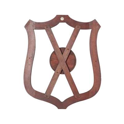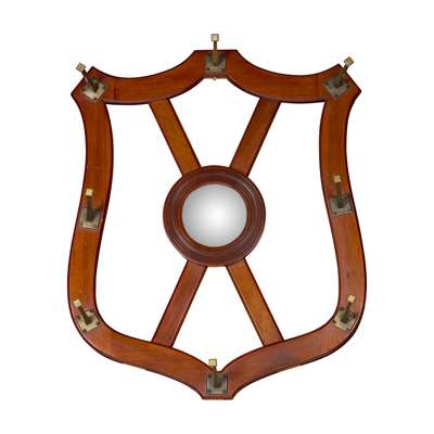the shield-shaped back centred by a circular mirror, and mounted with eight brass hooks, the reverse with an enamel trade label