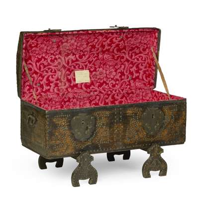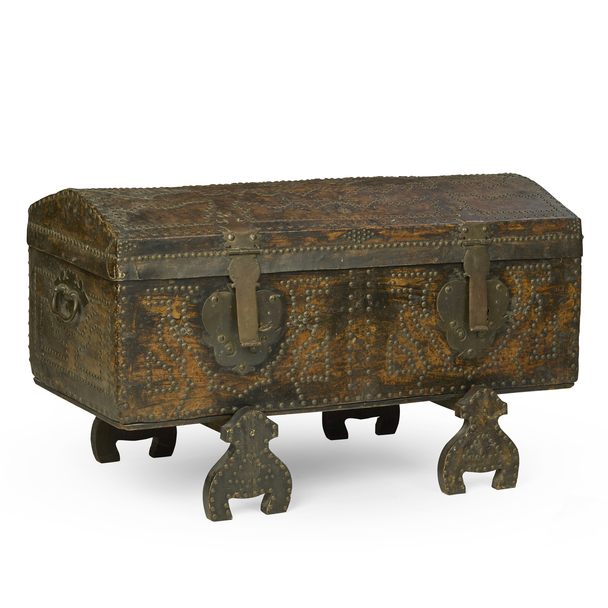 the domed hinged top with close nail studded decoration, opening to a later paper-lined interior, on carved fixed trestle supports