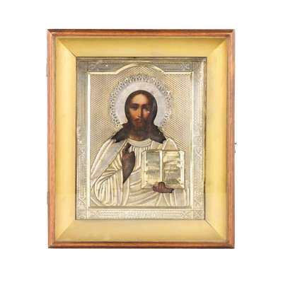 RUSSIAN SILVER MOUNTED ICON OF CHRIST PANTOCRATOR