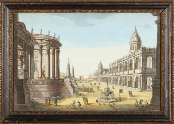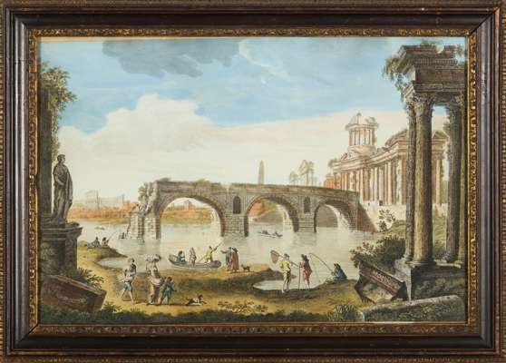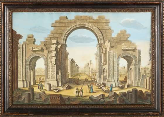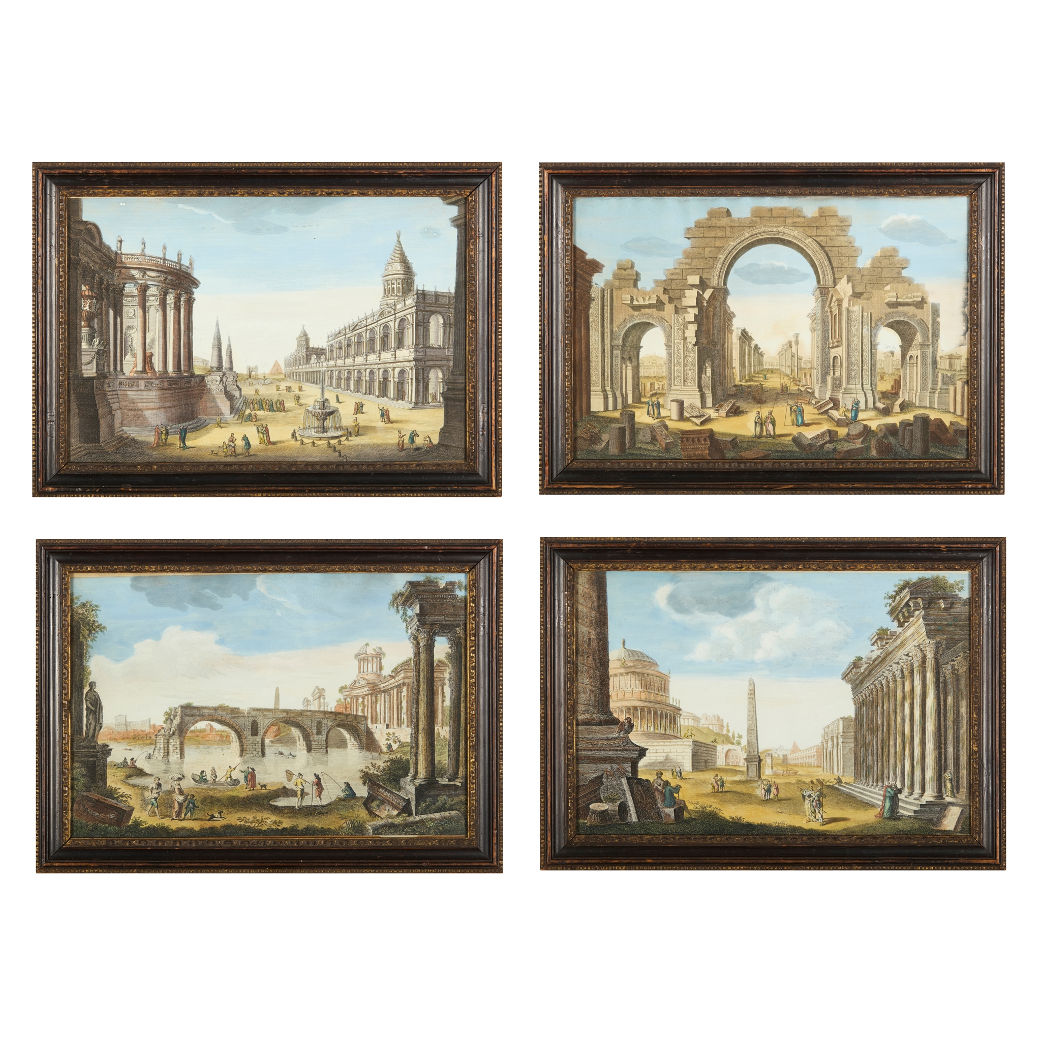 printed by Robert Sayer, opposite Fetter Lane, Fleet Street, depicting ‘The Remains of the Senatorial Bridge’, ‘The Temple of the Sun in Palmera’, 'Rome in it's Original Splendor' and ‘View of the Ruins of the Column of Trajan’, all within moulded and ebonised giltwood frames (4)