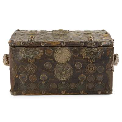applied throughout with copper tokens secured with brass studs, with further applied decoration in the form of copper or brass medallions depicting portraits or lions, with chased brass strap hinges, the sides with putto mask carrying handles