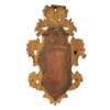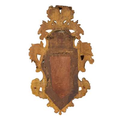 the cartouche shaped plate surmounted by a small oval plate, enclosed in a pierced frame carved with C scrolls, rocaille, and acanthus and surmounted by a large shell finial